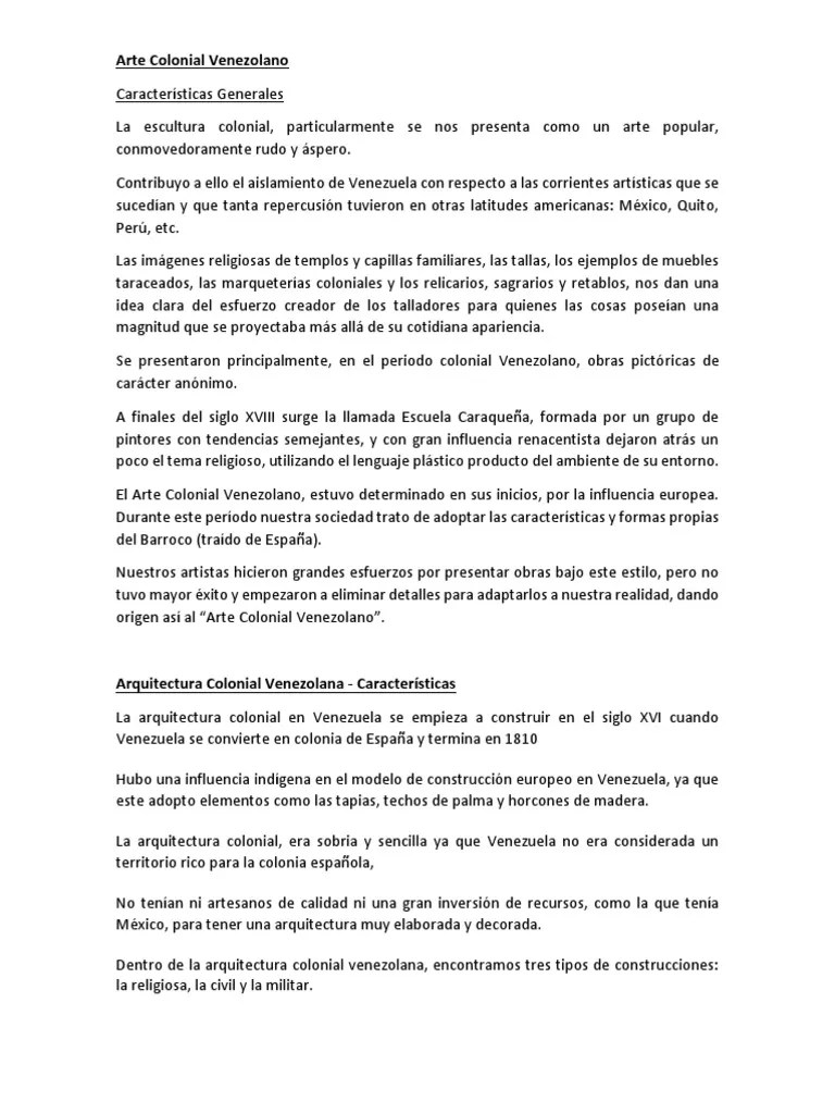 La colonia • el período colonial en venezuela comprende el tiempo transcurrido entre la fundación de las primeras ciudades (coro, 1527, el tocuyo, 1545) y la declaración de la independencia (19 de abril, 1810), pero en el mundo del arte es difícil precisar una fecha, porque durante gran parte del siglo xix se continuó la realización de obras siguiendo las técnicas y los temas de la. Actualmente se desempeña como profesora asociado en la escuela de artes en la universidad central de venezuela. A partir del siglo xvii, el estilo barroco comenzó a aparecer poco a poco en la arquitectura colonial.Los templos y conventos añadieron elementos barrocos a su arquitectura.